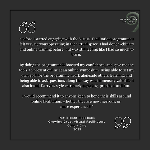 Growing Great Virtual Facilitators is an 8‑week group coaching programme that will help you start designing and delivering engaging live virtual sessions — with real practice, customised learning, and a supportive group.